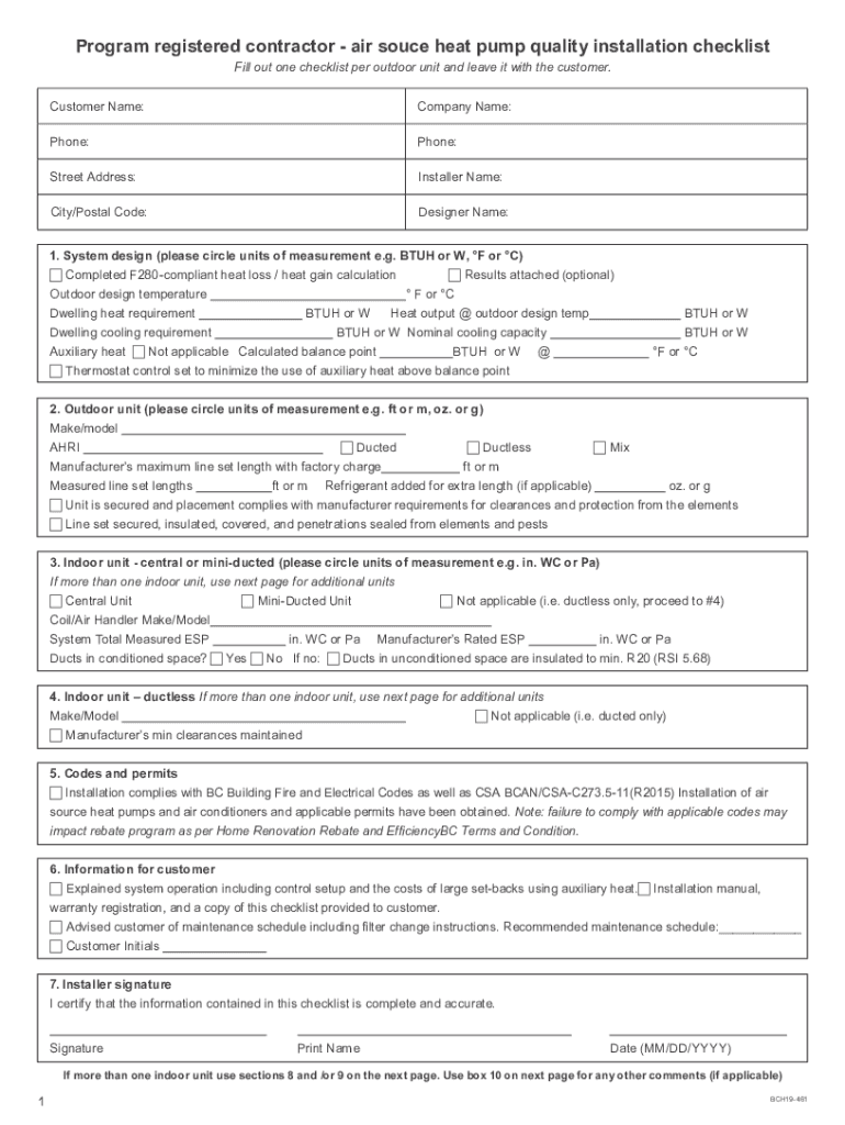 Program registered contractor air source heat pump quality installation checklist Fill out one checklist per outdoor unit and leave it with the customer. Customer Name:Company Name:Phone:Phone:Street
