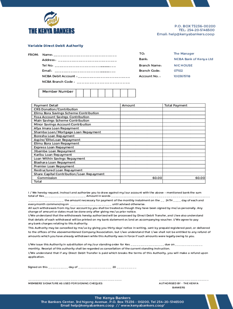 P.O. BOX 7323600200 TEL: 254205146500 Email: help@kenyabankers.coop Variable Direct Debit Authority FROM:Name: ___TO:The ManagerAddress : ___Bank:NCAA Bank of Kenya Lintel No: ___ ___Branch Name:NIC