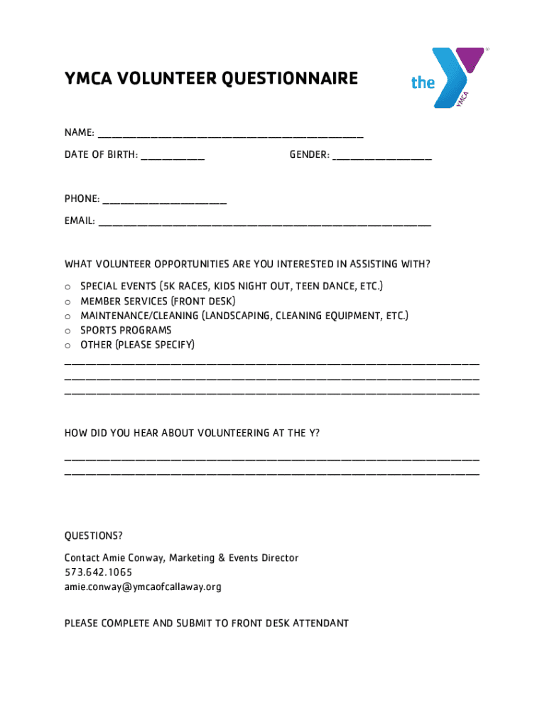 YMCA VOLUNTEER QUESTIONNAIRE NAME: ___ DATE OF BIRTH: ___GENDER: ___PHONE: ___ EMAIL: ___WHAT VOLUNTEER OPPORTUNITIES ARE YOU INTERESTED IN ASSISTING WITH? O SPECIAL EVENTS (5K RACES, KIDS NIGHT OUT,