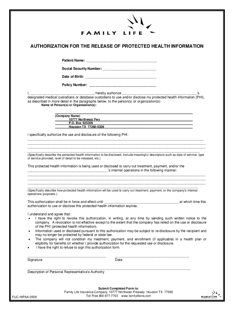 AUTHORIZATION FOR THE RELEASE OF PROTECTED HEALTH INFORMATION Patient Name: ___ Social Security Number: ___ Date of Birth: ___ Policy Number: ___ I, ___, hereby authorize ___s designated medical custodians