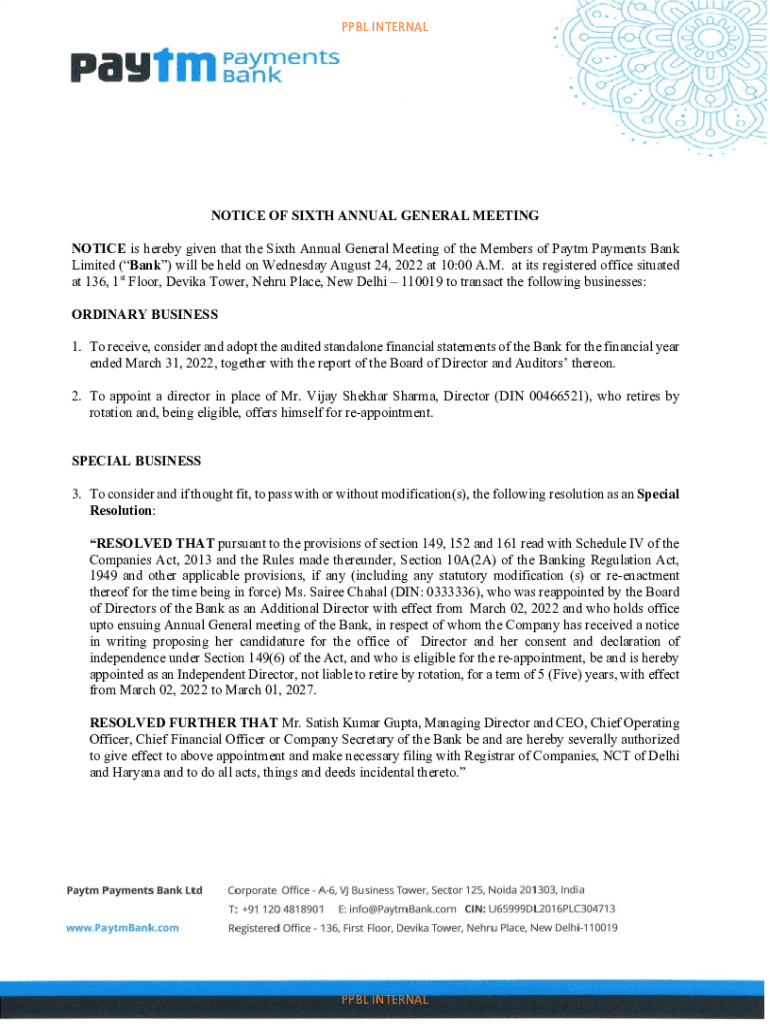PBL INTERNALNOTICE OF SIXTH ANNUAL GENERAL MEETING NOTICE is hereby given that the Sixth Annual General Meeting of the Members of Part Payments Bank Limited (Bank) will be held on Wednesday, August