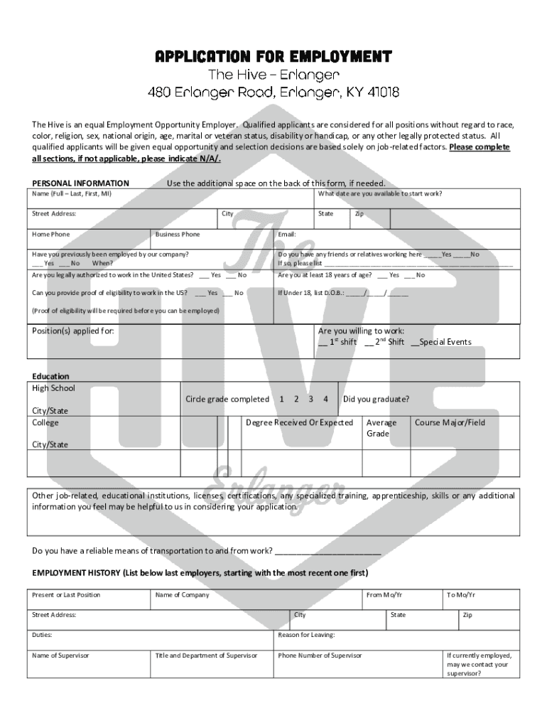 Get the free APPLICATION FOR EMPLOYMENT - The Hive