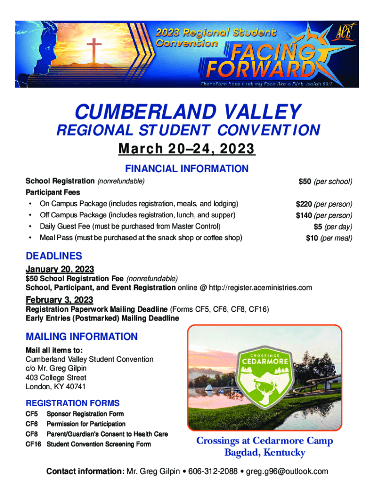 CUMBERLAND VALLEYREGIONAL STUDENT CONVENTION March 2024, 2023 FINANCIAL INFORMATION School Registration (nonrefundable) Participant Fees On Campus Package (includes registration, meals, and lodging)