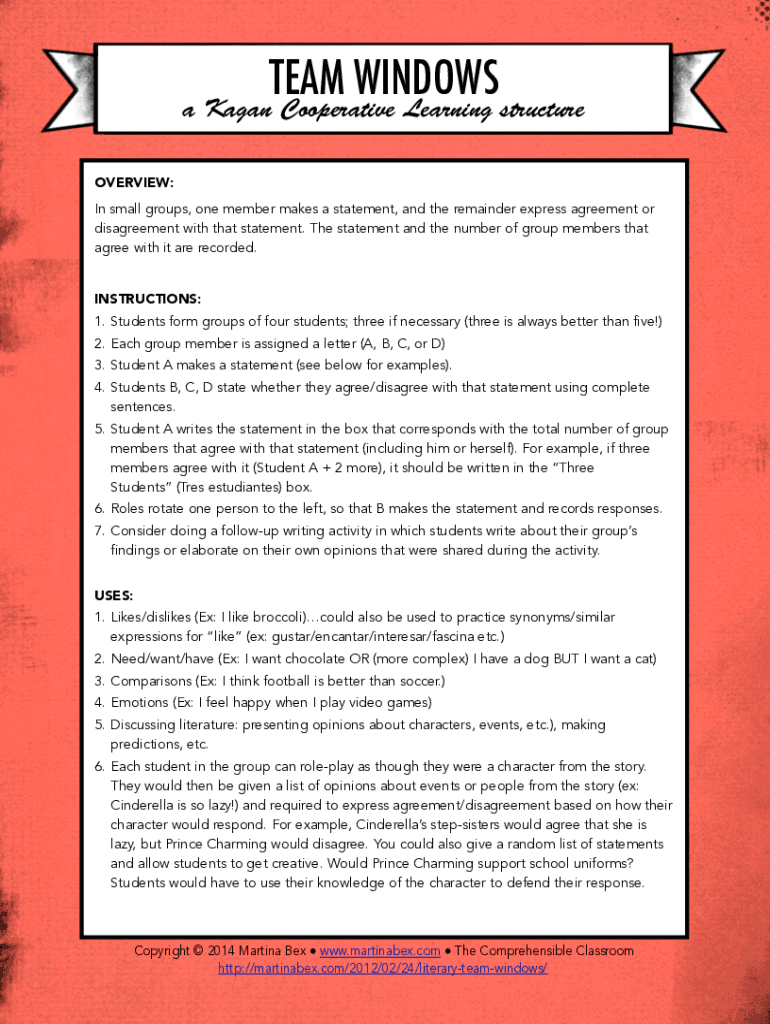 TEAM WINDOWS a Kagan Cooperative Learning structure OVERVIEW: In small groups, one member makes a statement, and the remainder express agreement or disagreement with that statement. The statement
