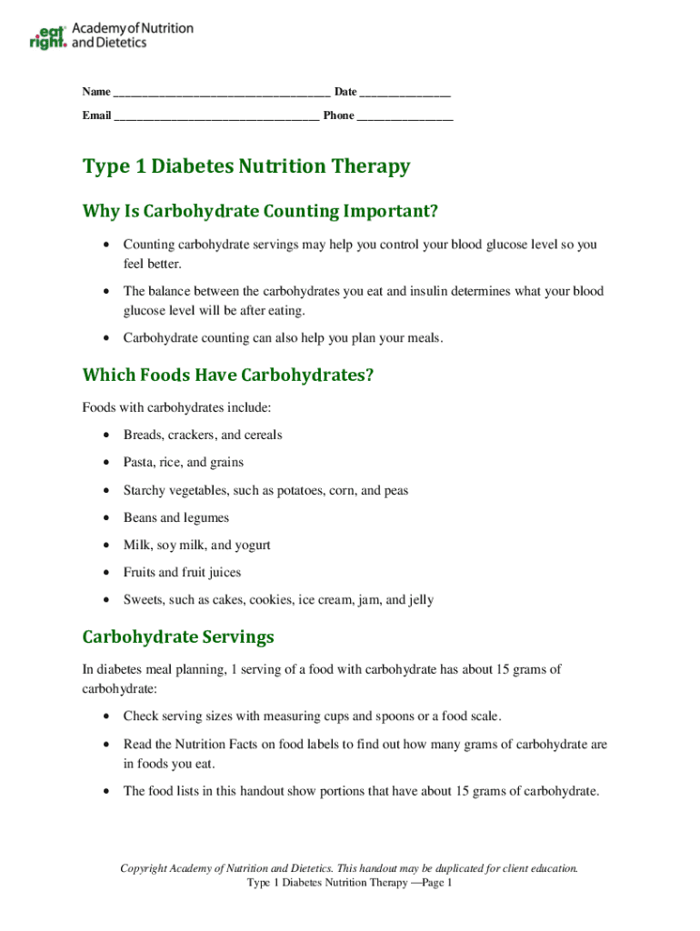 Name ___ Date ___ Email ___ Phone ___Type 1 Diabetes Nutrition Therapy Why Is Carbohydrate Counting Important? Counting carbohydrate servings may help you control your blood glucose level, so you