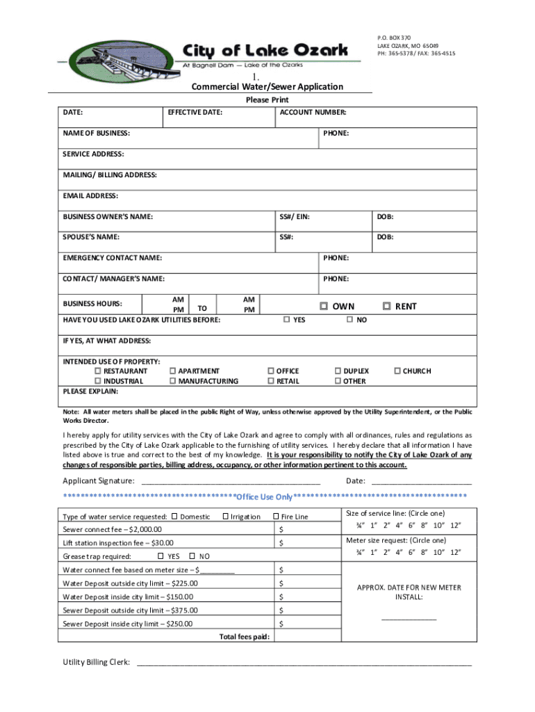 P.O. BOX 370 LAKE OZARK, MO 65049 PH: 3655378 / FAX: 36545151. Commercial Water/Sewer Application Please Print DATE:EFFECTIVE DATE:ACCOUNT NUMBER:NAME OF BUSINESS:PHONE:SERVICE ADDRESS: MAILING/ BILLING