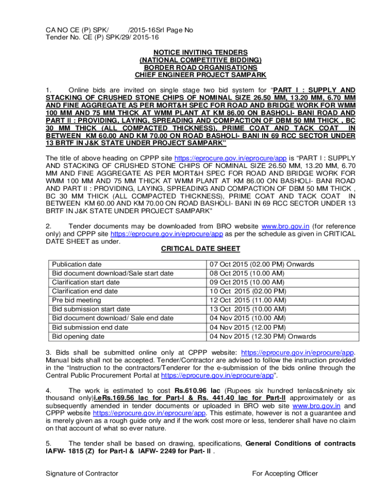 CA NO CE (P) SPY/ /201516Srl Page No Tender No. CE (P) SPY/29/ 201516 NOTICE INVITING TENDERS (NATIONAL COMPETITIVE BIDDING) BORDER ROAD Organizations CHIEF ENGINEER PROJECT SPARK 1. Online bids are