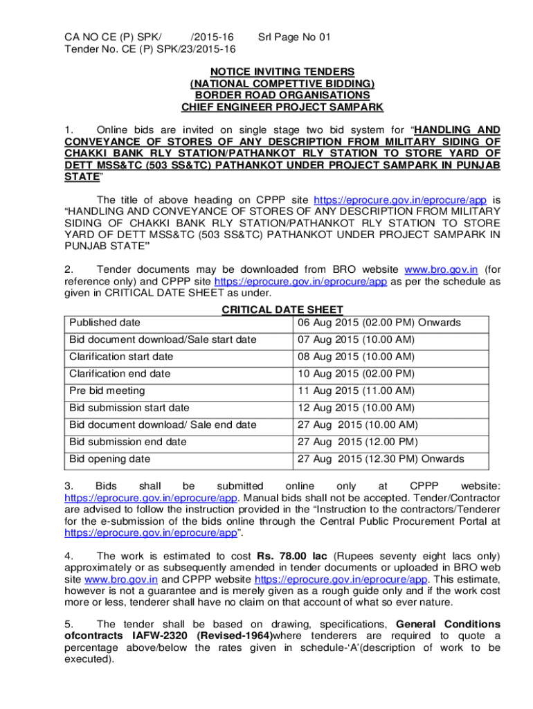 CA NO CE (P) SPY/ /201516 Tender No. CE (P) SPY/23/201516Srl Page No 01NOTICE INVITING TENDERS (NATIONAL COMPETITIVE BIDDING) BORDER ROAD Organizations CHIEF ENGINEER PROJECT SPARK 1. Online bids