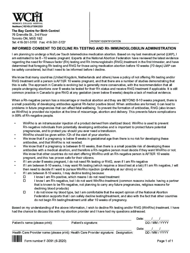 ___The Bay Center for Birth Control 76 Grenville St., 3rd Floor Toronto ON, M5S 1B2 Tel: 4163513700 Fax: 4163513727PATIENT IDENTIFICATION ___INFORMED CONSENT TO DECLINE Rh TESTING AND Rh IMMUNOGLOBULIN