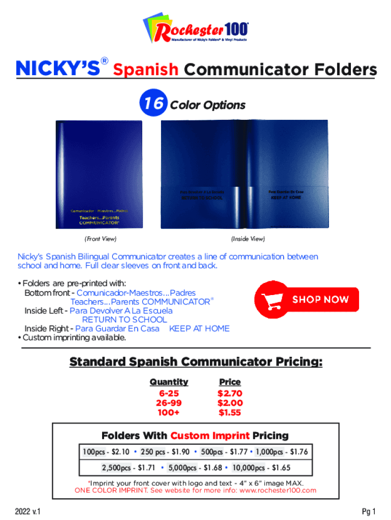 NICKS Spanish Communicator Folders 16Color Options(Inside View)(Front View)Nicky\'s Spanish Bilingual Communicator creates a line of communication between school and home. Full clear sleeves on front