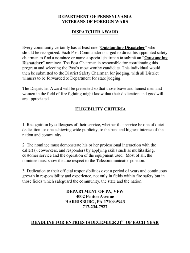 DEPARTMENT OF PENNSYLVANIA VETERANS OF FOREIGN WARS DISPATCHER AWARD Every community certainly has at least one Outstanding Dispatcher who should be recognized. Each Post Commander is urged to direct