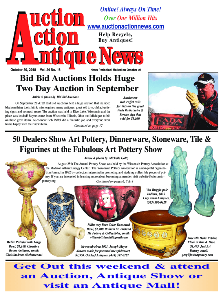 Online! Always On Time! Over One Million Hits www.auctionactionnews.com Help Recycle, Buy Antiques! October 30, 2018Vol. 24 No. 16News Periodical Mailed on October 24Bid Bid Auctions Holds Huge Two