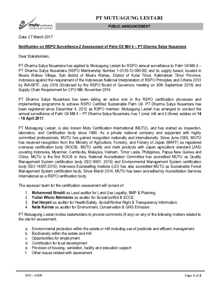 PT MUTATING LEST ARI PUBLIC ANNOUNCEMENTDate: 27 March 2017 Notification on RPO Surveillance2 Assessment of Palm Oil Mill 4 PT Dharma Satya Santana Dear Stakeholders, PT Dharma Satya Santana has applied
