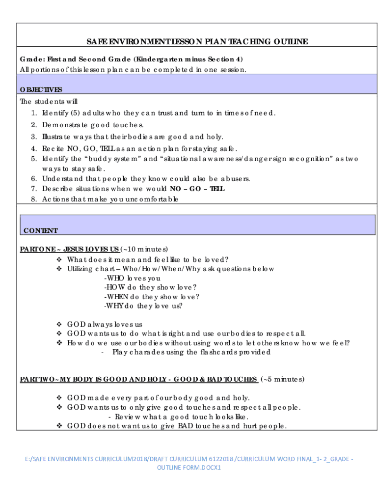 SAFE ENVIRONMENT LESSON PLAN TEACHING OUTLINE Grade: First and Second Grade (Kindergarten minus Section 4) All portions of this lesson plan can be completed in one session. OBJECTIVES The students