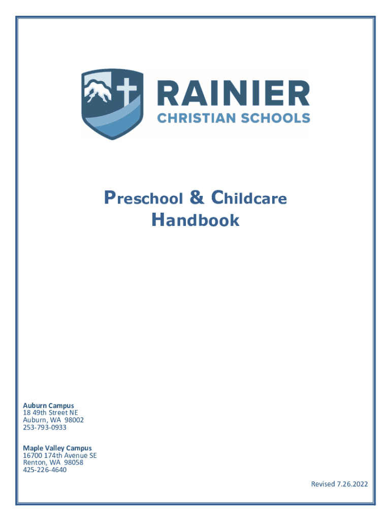 Preschool & Childcare Handbook Auburn Campus 18 49th Street NE Auburn, WA 98002 2537930933 Maple Valley Campus 16700 174th Avenue SE Renton, WA 98058 4252264640 Revised 7.26.2022Rainier Christian