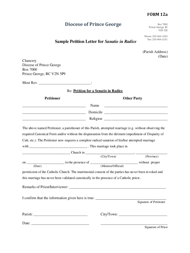 FORM 12aDiocese of Prince George 7000 Prince George, BC V2N 3Z2 Phone: 2509644424 Fax: 2509642101Sample Petition Letter for Sanction in Ra dice(Parish Address) (Date) Chancery Diocese of Prince George