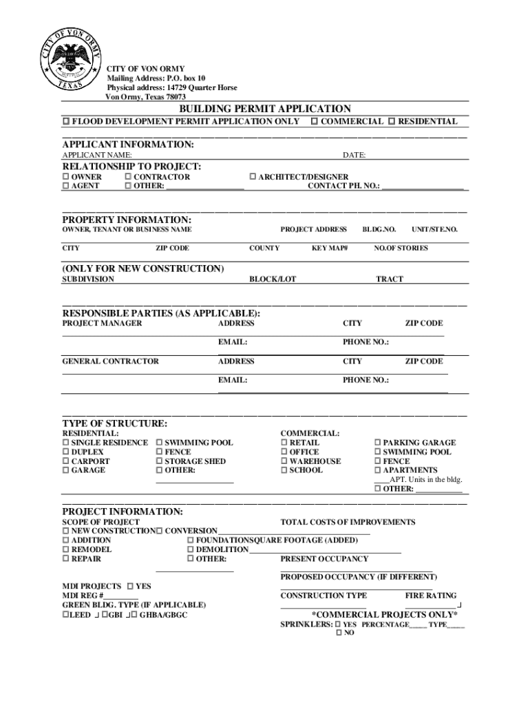 CITY OF ON ARMY Mailing Address: P.O. box 10 Physical address: 14729 Quarter Horse On Army, Texas 78073BUILDING PERMIT APPLICATION FLOOD DEVELOPMENT PERMIT APPLICATION ONLY COMMERCIAL RESIDENTIAL___