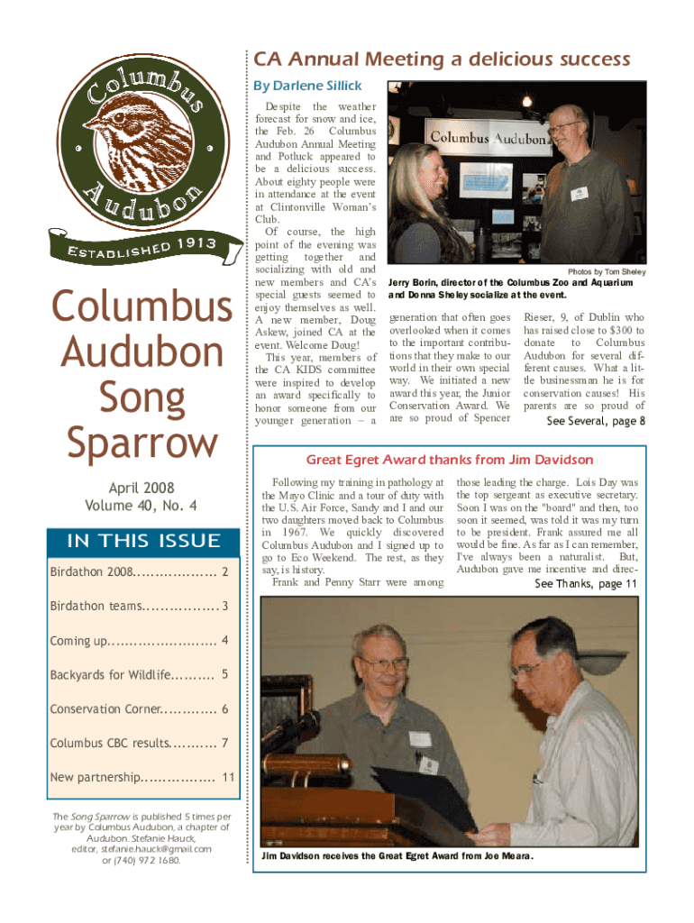CA Annual Meeting a delicious success By Darlene SillickColumbus Audubon Song Sparrow April 2008 Volume 40, No. 4IN THIS ISSUE Marathon 2008................... 2Despite the weather forecast for snow