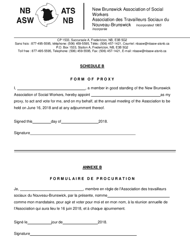 New Brunswick Association of Social Workers Association DES Travailleurs Social du NouveauBrunswick Incorporated 1965 Incorporeal 1533, Succursale A, Fredericton, NB, E3B 5G2 Sans fries : 8774955595,