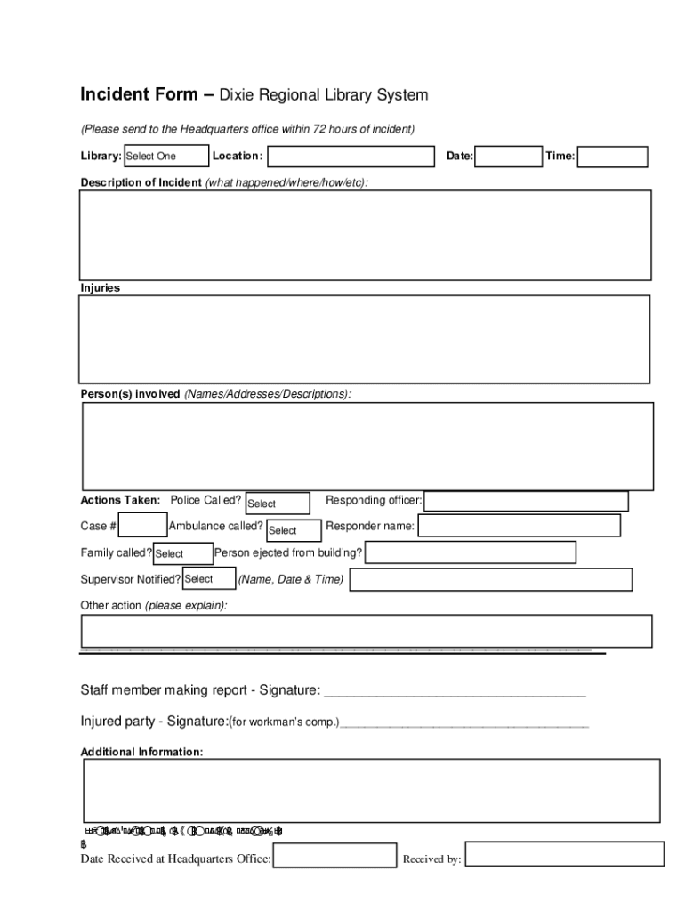 Incident Form Dixie Regional Library System (Please send to the Headquarters office within 72 hours of incident) Library: Select Relocation:Date:Time:Description of Incident (what happened/where/how/etc):InjuriesPerson(s)