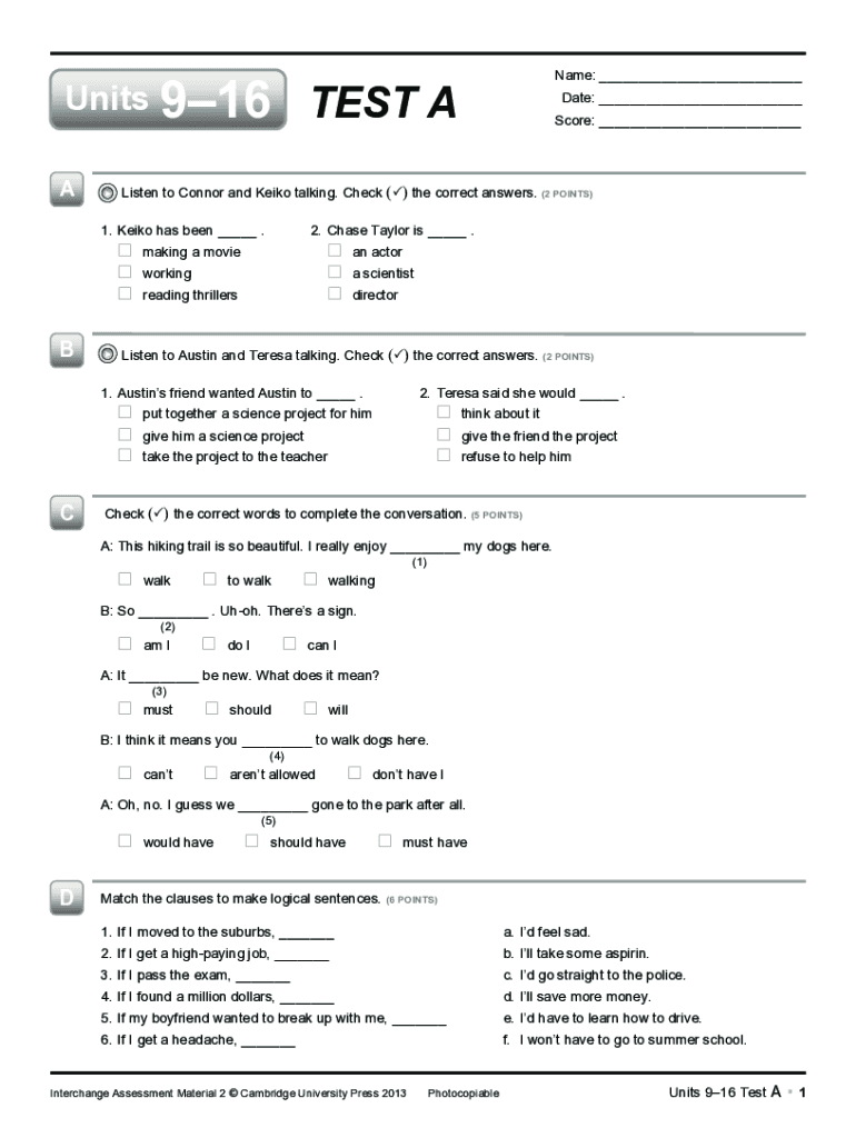 Name: ___Units 916 TEST A 2. Chase Taylor is ___. Making a movie working reading thrillers an actor a scientist directorListen to Austin and Teresa talking. Check () the correct answers. (2 POINTS)1.