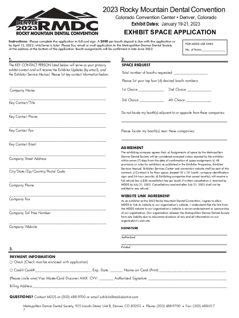2023 Rocky Mountain Dental Convention Colorado Convention Center Denver, ColoradoExhibit Dates: January 1921, 2023EXHIBIT SPACE APPLICATION Instructions: Please complete the application in full and