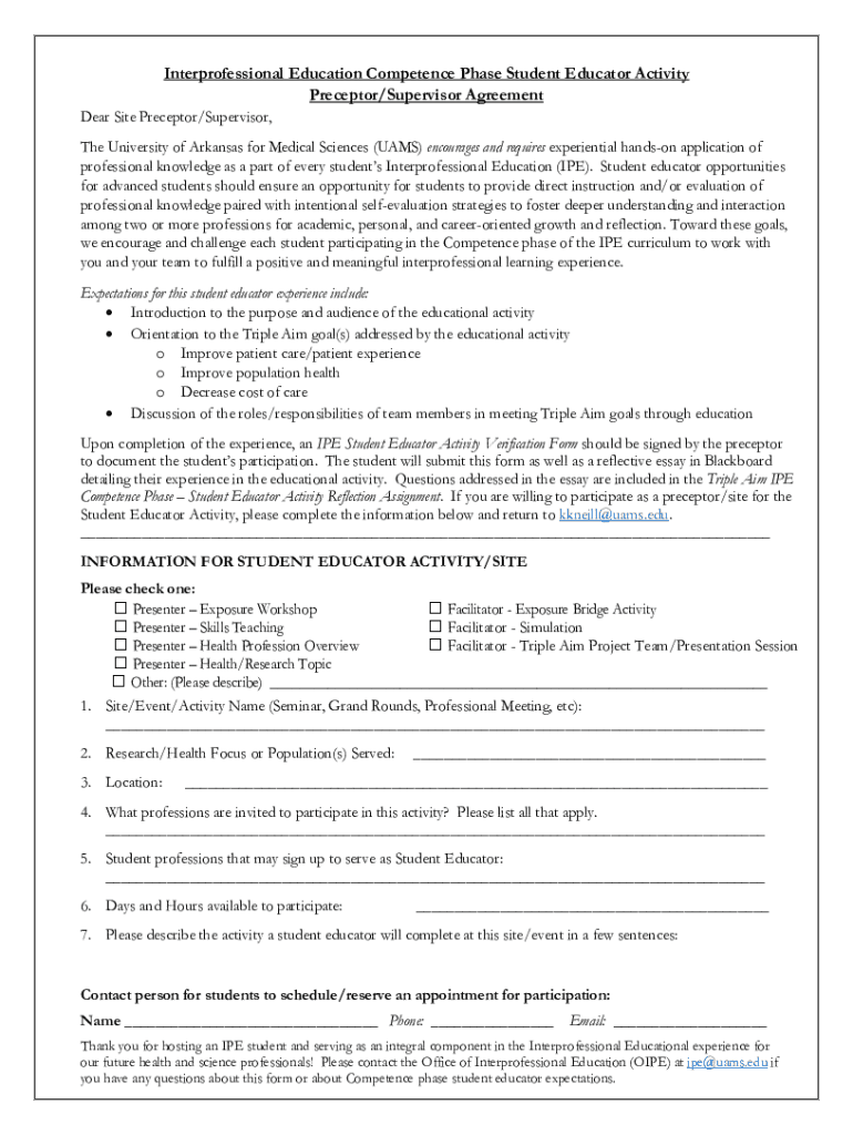Preceptor/Supervisor AgreementDear Site Preceptor/Supervisor, The University of Arkansas for Medical Sciences (DAMS) encourages