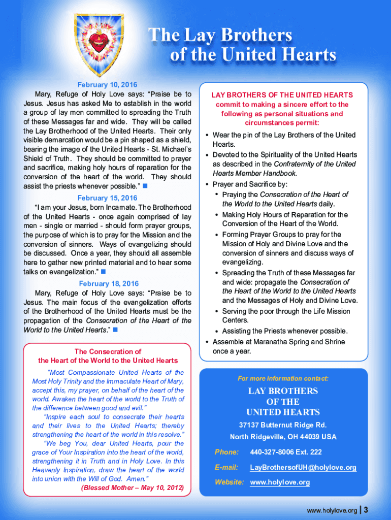 February 10, 2016, Mary, Refuge of Holy Love says: Praise be to Jesus. Jesus has asked Me to establish in the world a group of lay men committed to spreading the Truth of these Messages far and wide.