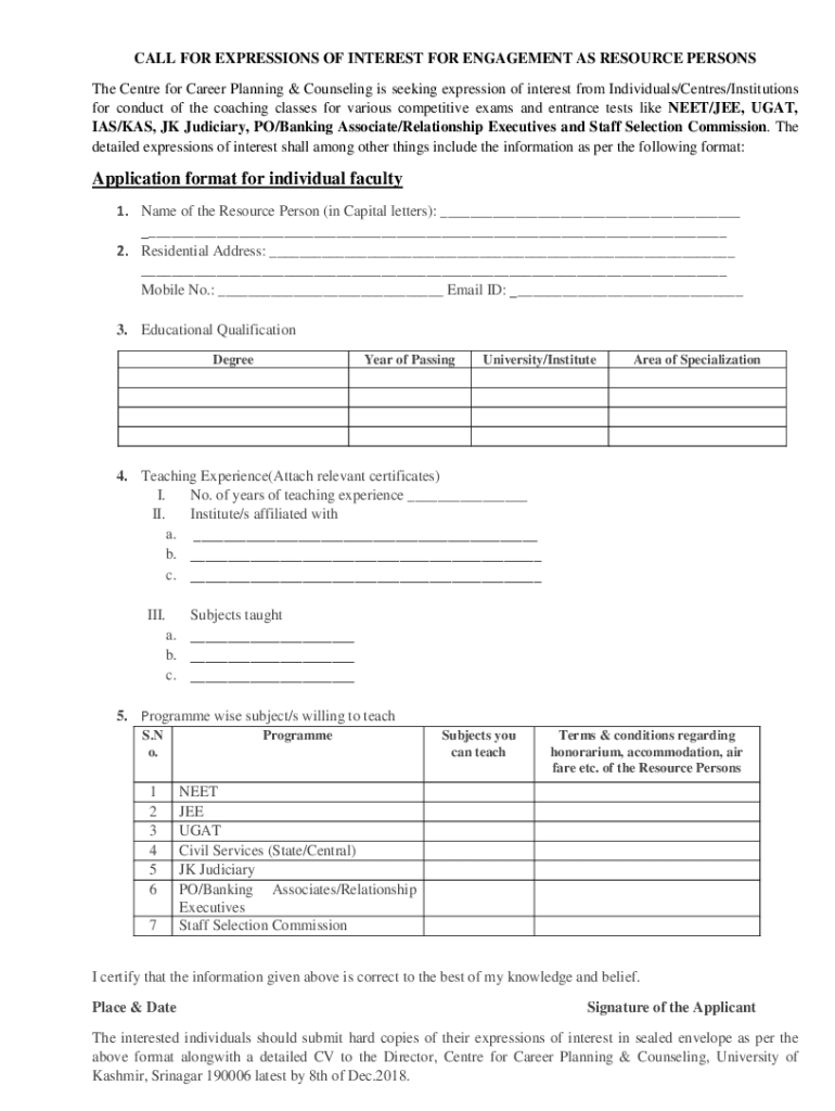 CALL FOR EXPRESSIONS OF INTEREST FOR ENGAGEMENT AS RESOURCE PERSONS The Center for Career Planning & Counseling is seeking expression of interest from Individuals/Centers/Institutions for conduct