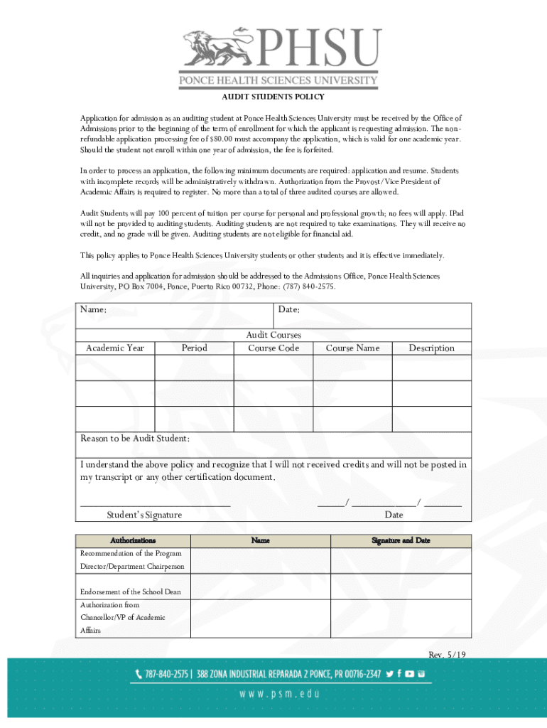 AUDIT STUDENTS POLICY Application for admission as an auditing student at Ponce Health Sciences University must be received by the Office of Admissions prior to the beginning of the term of enrollment