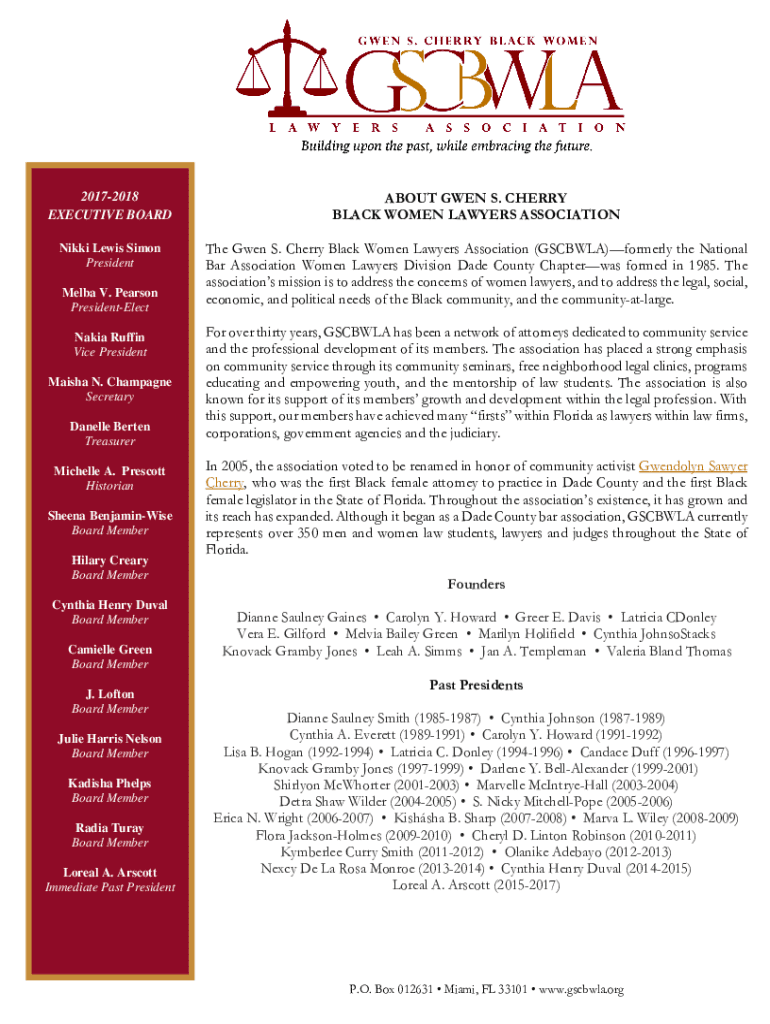 20172018 EXECUTIVE MARABOUT GWEN S. CHERRY BLACK WOMEN LAWYERS ASSOCIATION Nikki Lewis Simon President Gwen S. Cherry Black Women Lawyers Association (SCALA)formerly the National Bar Association Women