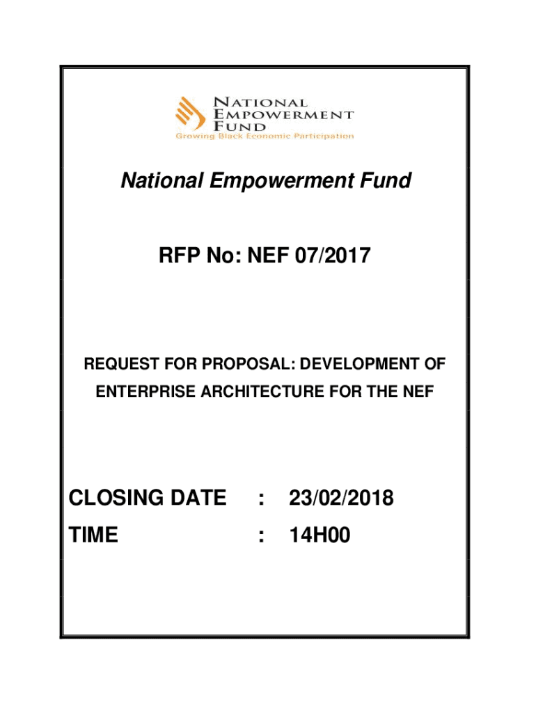 National Empowerment Fund RFP No: NEW 07/2017REQUEST FOR PROPOSAL: DEVELOPMENT OF ENTERPRISE ARCHITECTURE FOR THE ENCLOSING DATE:23/02/2018TIME:14H002CONDITIONS AND UNDERTAKINGS BY BIDDERS IN RESPECT