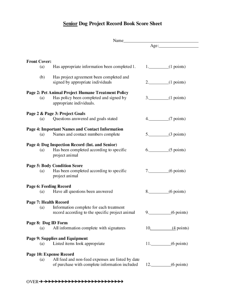 Senior Dog Project Record Book Scoresheet Name___ Age:___Front Cover: (a) Has appropriate information been completed 1. (b)Has project agreement been completed and signed by appropriate individuals