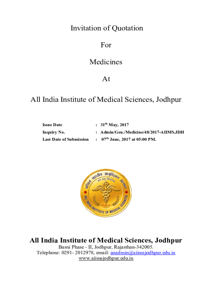 Invitation of Quotation For Medicines At All India Institute of Medical Sciences, JodhpurIssue Date: 31st May, 2017Inquiry No.: Admin/Gen./Medicine/48/2017AIIMS. Last Date of Submission: 07th June