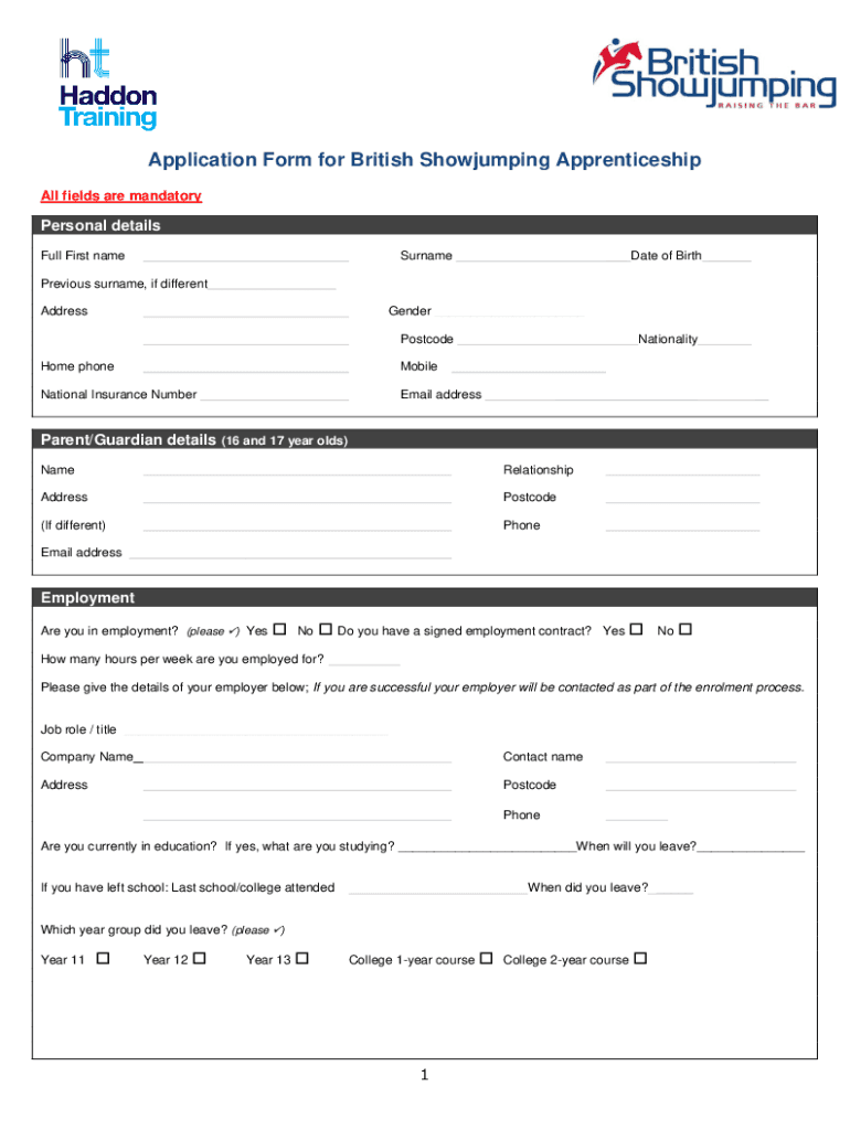 Get the free Application Form for British Showjumping Apprenticeship