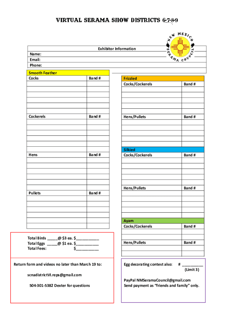 6789Exhibitor Information Name: Email: Phone: Check One: OPEN Smooth Feather Cocks JUNIOR Band #Frizzled Cocks/CockerelsBand #CockerelsBand #Hens/PulletsBand #Husband #Silkier Cocks/CockerelsBand