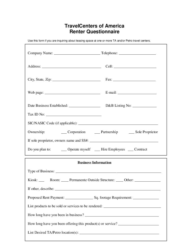TravelCenters of America Renter Questionnaire Use this form if you are inquiring about leasing space at one or more TA and/or Metro travel centers. Company Name: ___ Telephone: ___Address: ___Cell: