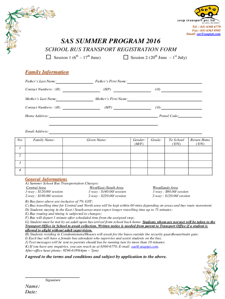 Tel : (65) 6360 6770 Fax: (65) 6363 8501 Email: sas@yeaptpt.comSAS SUMMER PROGRAM 2016 SCHOOL BUS TRANSPORT REGISTRATION FORM Session 1 (6th 17th June)Session 2 (20th June 1st July)Family Information