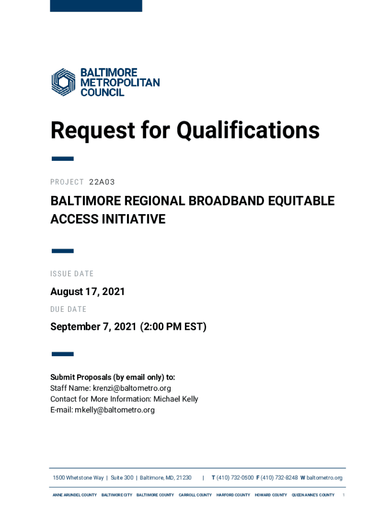 Request for QualificationsPROJE C T 22A03BALTIMORE REGIONAL BROADBAND EQUITABLE ACCESS INITIATIVE S UE DA August 17, 2021, DUE DA September 7, 2021 (2:00 PM EST)Submit Proposals (by email only) to: