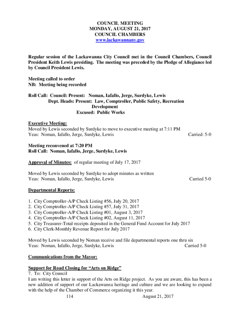 COUNCIL MEETING MONDAY, AUGUST 21, 2017, COUNCIL CHAMBERS www.lackawannany.govRegular session of the Lackawanna City Council met in the Council Chambers, Council President Keith Lewis presiding. The
