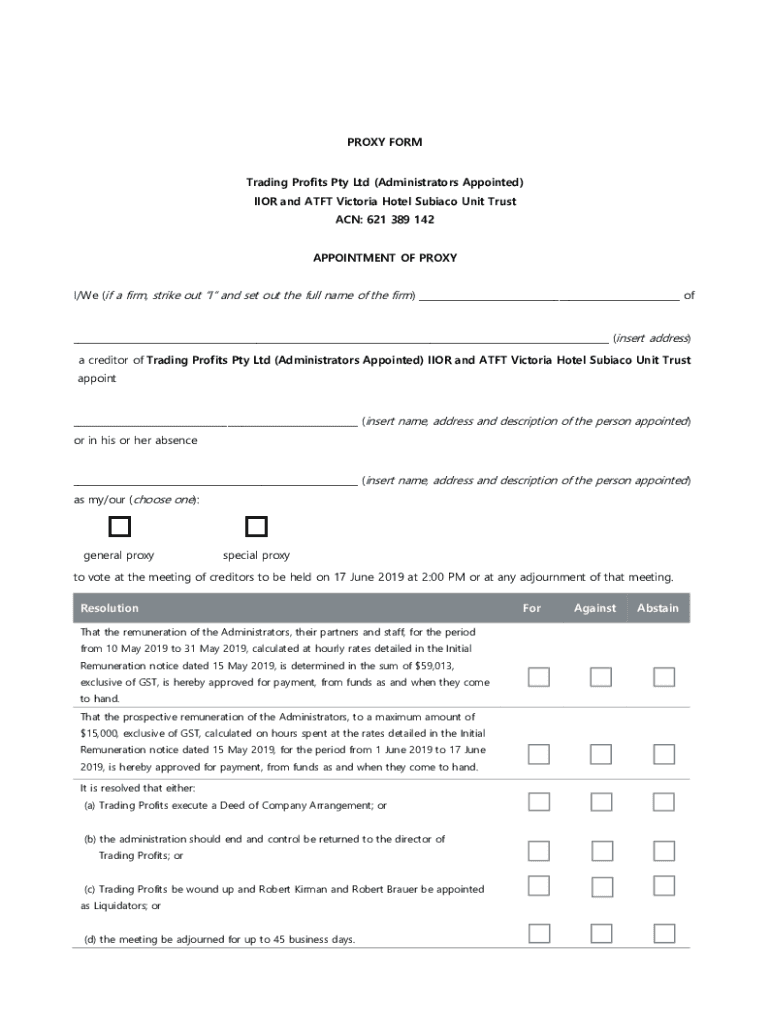 PROXY FORM Trading Profits Pty Ltd (Administrators Appointed) IGOR and AFT Victoria Hotel Subrace Unit Trust ACN: 621 389 142 APPOINTMENT OF PROXY I/We (if a firm, strike out I and set out the full