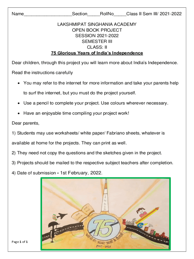 Name___Section___RollNo___Class II SEM III/ 20212022 LAKSHMI SONGHAI ACADEMY OPEN BOOK PROJECT SESSION 20212022 SEMESTER III CLASS: II 75 Glorious Years of India's Independence Dear children, through