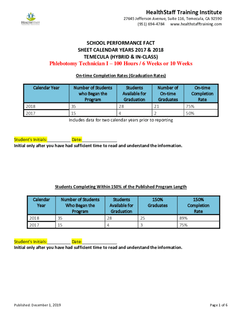 HealthStaff Training Institute 27645 Jefferson Avenue, Suite 116, Temecula, CA 92590 (951) 6944784 www.healthstafftraining.comSCHOOL PERFORMANCE FACT SHEET CALENDAR YEARS 2017 & 2018 TEMECULA (HYBRID