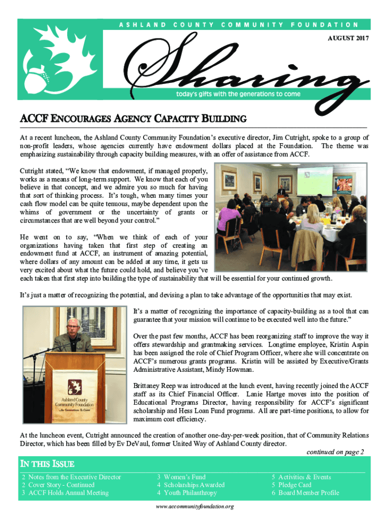 AUGUST 2017todays gifts with the generations to compact ENCOURAGES AGENCY CAPACITY BUILDING ___At a recent luncheon, the Ashland County Community Foundations executive director, Jim Outright, spoke