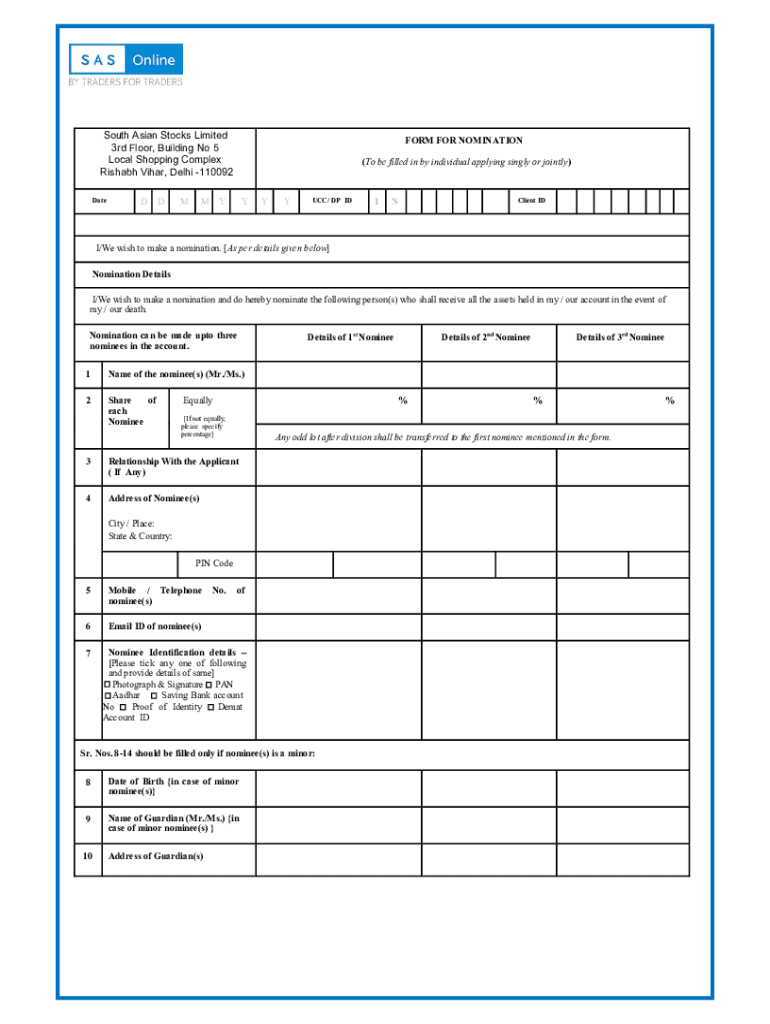 South Asian Stocks Limited 3rd Floor, Building No 5 Local Shopping Complex Rishabh Vicar, Delhi 110092 DateDDMFORM FOR NOMINATION (To be filled in by individual applying singly or jointly’M YYYYUCC/