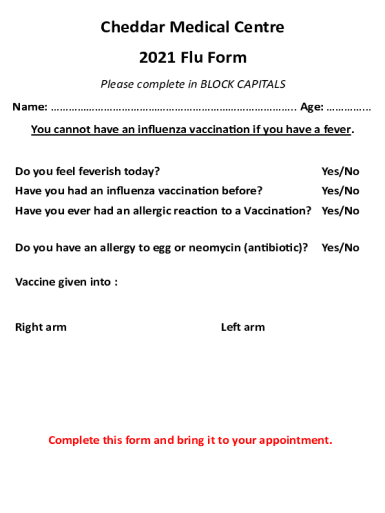 Cheddar Medical Center 2021 Flu Form Please complete in BLOCK CAPITALS Name:. Age: ... You cannot have an influenza vaccination if you have a fever. Do you feel feverish today? Yes/Mohave you had