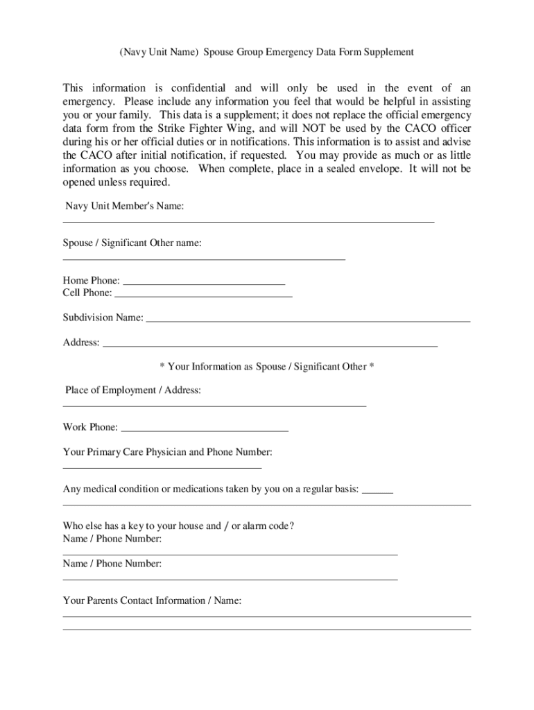 (Navy Unit Name) Spouse Group Emergency Data Form Supplements information is confidential and will only be used in the event of an emergency. Please include any information you feel that would be