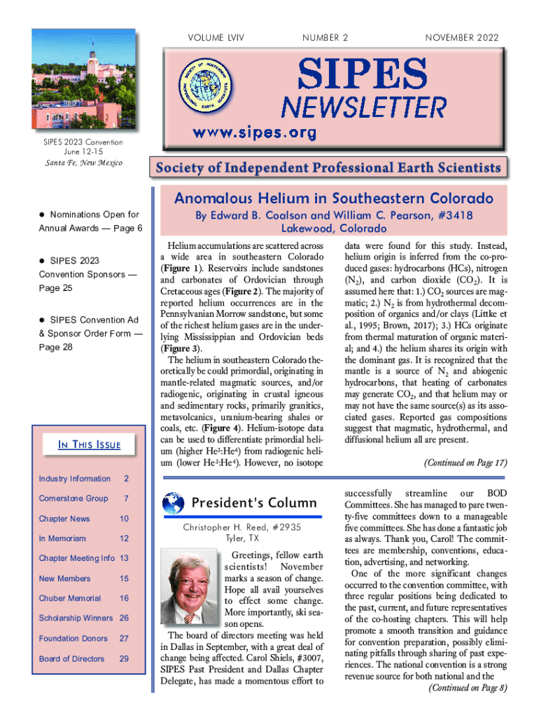 VOLUME LVIVNUMBER 2NOVEMBER 2022SIPES 2023 Convention June 1215Santa Fe, New MexicoSociety of Independent Professional Earth ScientistsAnomalous Helium in Southeastern Colorado Nominations Open annual