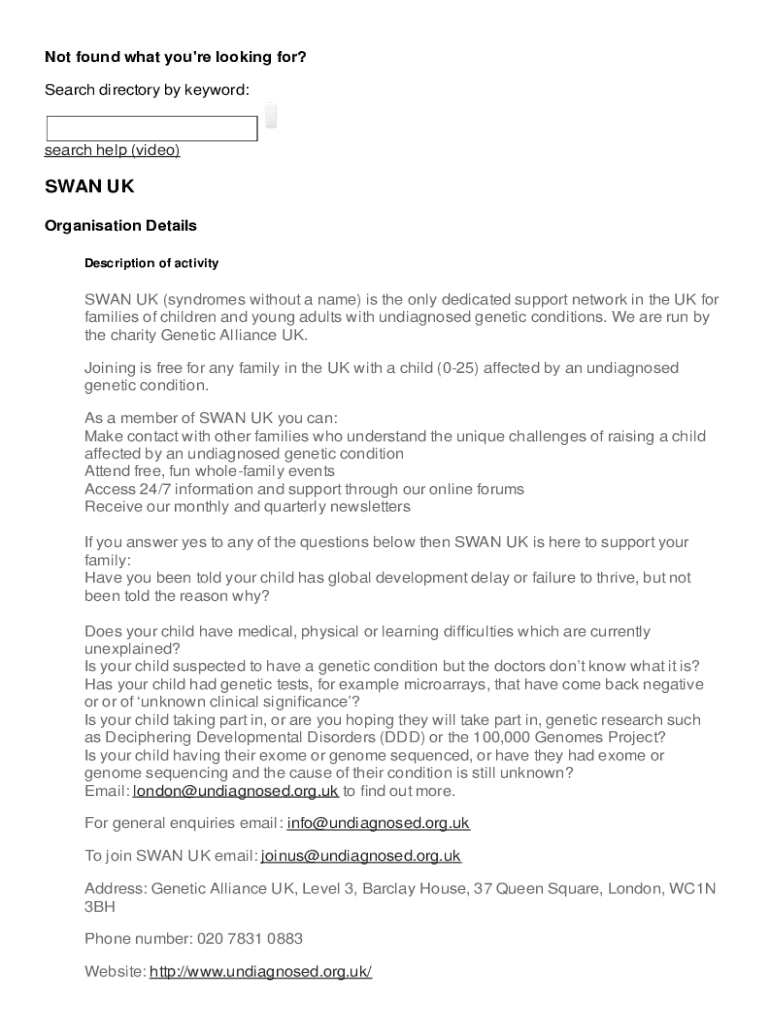 Not found what you\'re looking for? Search directory by keyword:search help (video)SWAN UK Organization Details Description of activitySWAN UK (syndromes without a name) is the only dedicated support