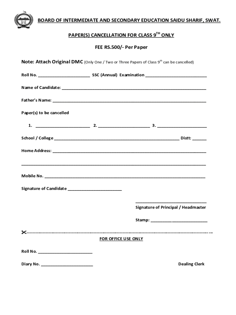 BOARD OF INTERMEDIATE AND SECONDARY EDUCATION SAID SHARIF, SWAT. PAPER(S) CANCELLATION FOR CLASS 9TH ONLY FEE RS.500/ Per Paper Note: Attach Original DMC (Only One / Two or Three Papers of Class 9th